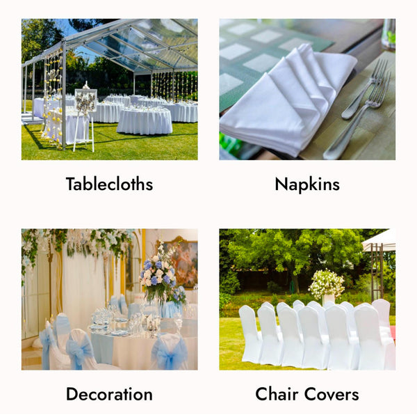 Hey there, party planners and event enthusiasts! Ready to turn your plain old venue into a jaw-dropping masterpiece? Look no further than My Linen Hire. With our linen hire services, we're here to sprinkle a little magic onto your blank canvas. Whether you're aiming for a whimsical wonderland or a sleek and sophisticated soirée, our rainbow of colors and textures has got you covered. From bold and bright to soft and subtle- we've got tablecloths, napkins, bows and runners to hire, to match every theme and budget. So, go ahead, dream big! Let's transform your event space into a dazzling spectacle that'll leave your guests oohing and aahing all night long. Let the fun begin!